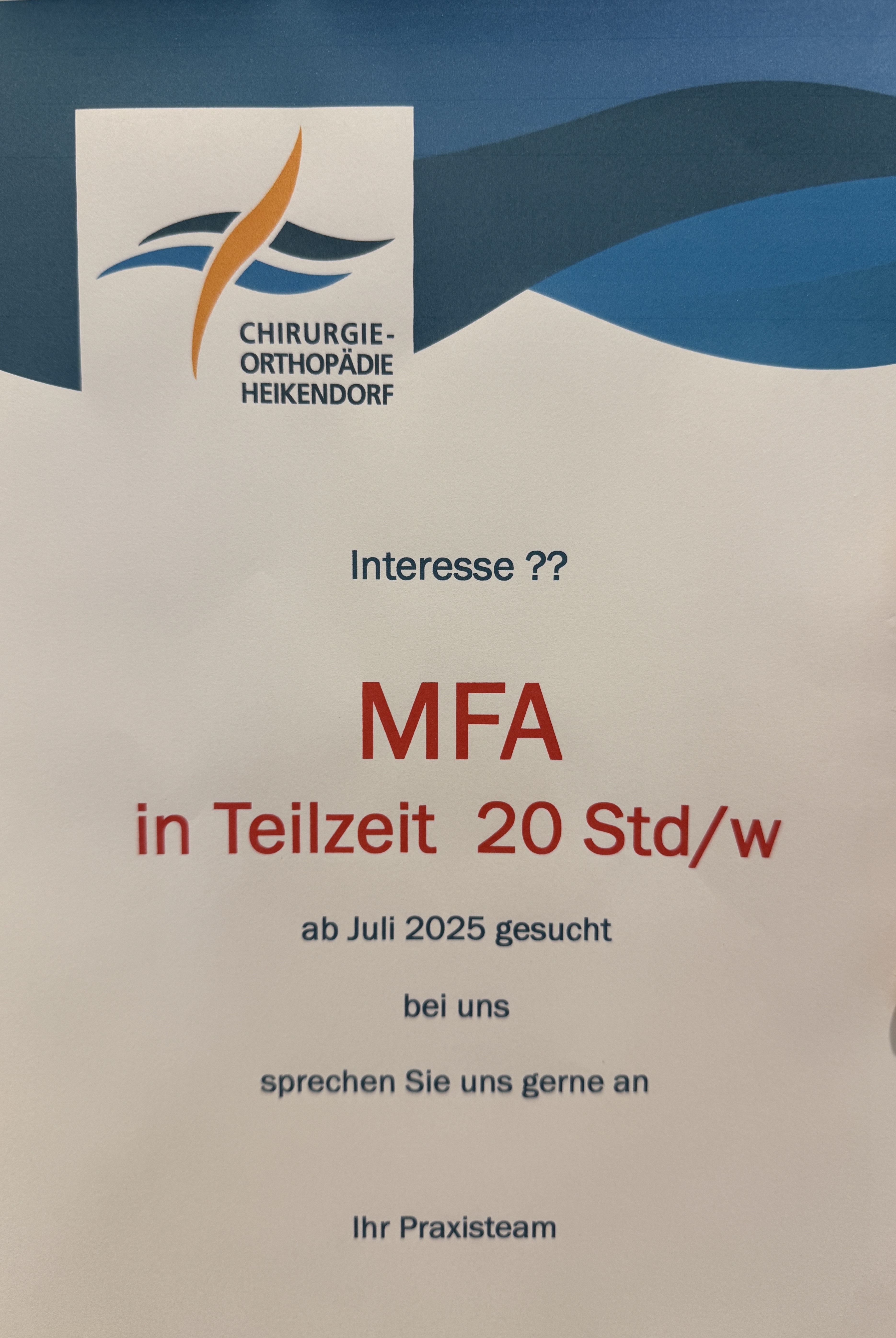 Zur Verstärkung suchen wir für mind. 20-30h/Woche eine zuverlässige medizinische Fachangestellte (MFA) oder eine engagierte Quereinsteiger\*in,die Lust auf eine sinnvolle Aufgabe in einem starken Team hat.