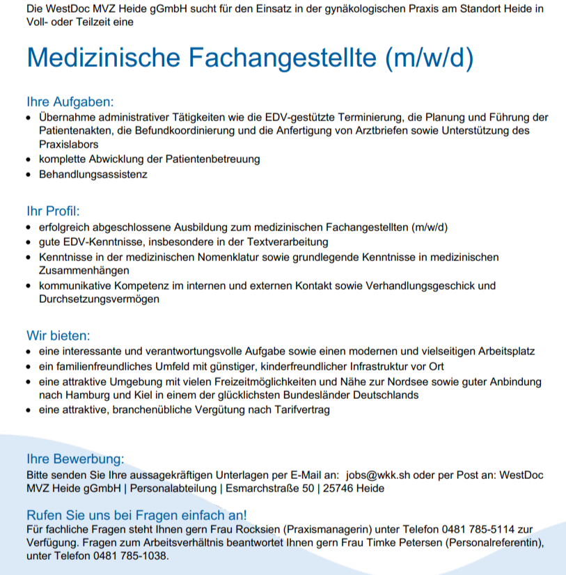 Fachliche Fragen richten Sie bitte an die Praxismanagerin Frau Birgit Rocksien unter Tel.: 0481-7855114 Fragen zum Arbeitsverhältnis richten Sie bitte an die Personalreferentin Frau Timke Petersen unter Tel.: 0481-7851038